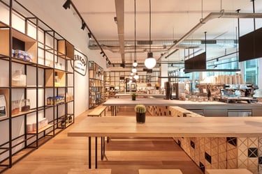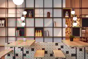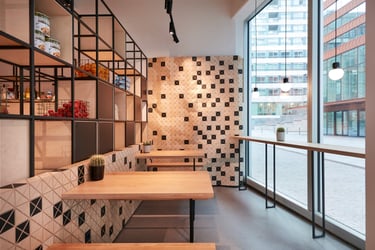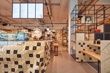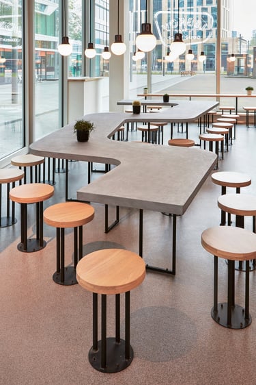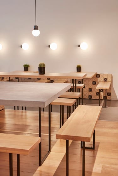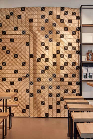 The result is a harmonious, visually dynamic space where black-and-wood cladding unifies the environment, while wood, concrete, and steel materials interact subtly under the warm, discreet lighting design to evoke a welcoming, authentic atmosphere. Through this complex fusion of materials, shapes, and textures, the space evolves into a distinctive “third place,” where guests can experience comfort and creativity in equal measure.