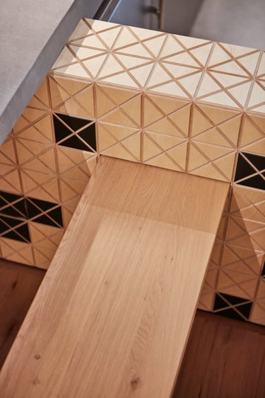 The space is defined by an innovative reinterpretation of the iconic Lebkov pattern, now transformed into a textured landscape of black and light-colored wooden panels. This design brings an organic flow to furniture and wall claddings through engraved, crumpled surfaces that adhere precisely to the linear edges required for countertops, doors, and other structural elements.