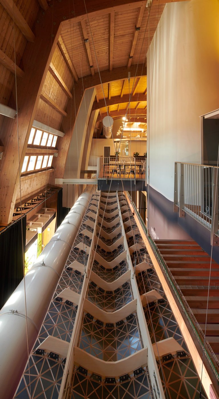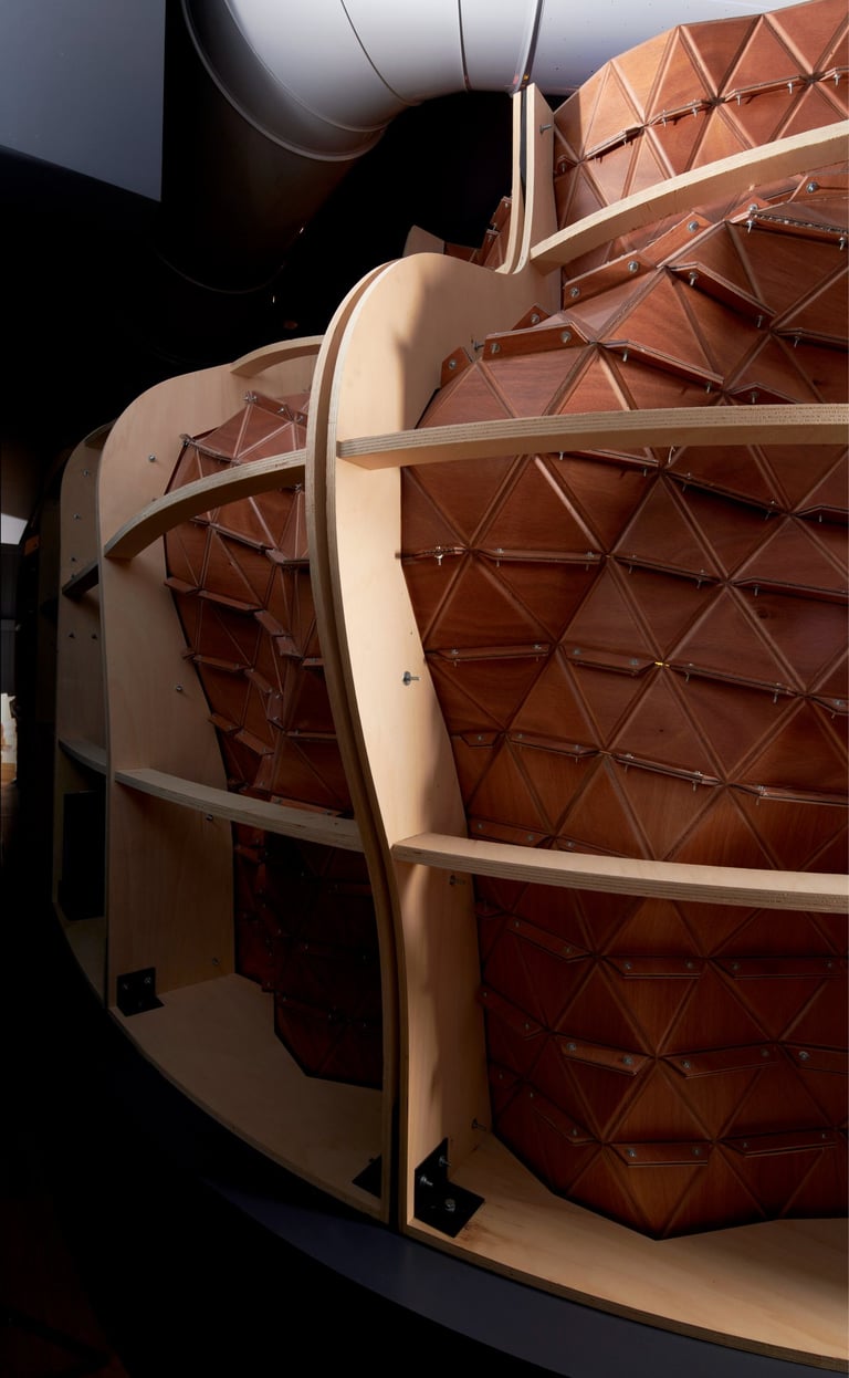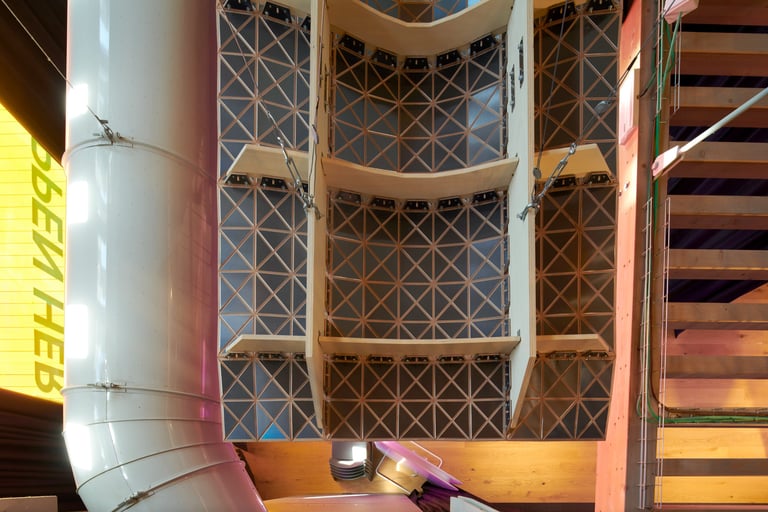 Leveraging advanced computational design, complex algorithms for developable surfaces and tessellation were developed and applied to obtain precise geometric constraints, in order to achieve the seamless transformation from concept to construction. We implemented a digital-twin approach early on, which streamlined the design, manufacturing, and assembly processes. This method allowed real-time assessments of deformations, tensions, and structural loads by comparing the digital model to the installed version, ensuring precision and structural integrity.